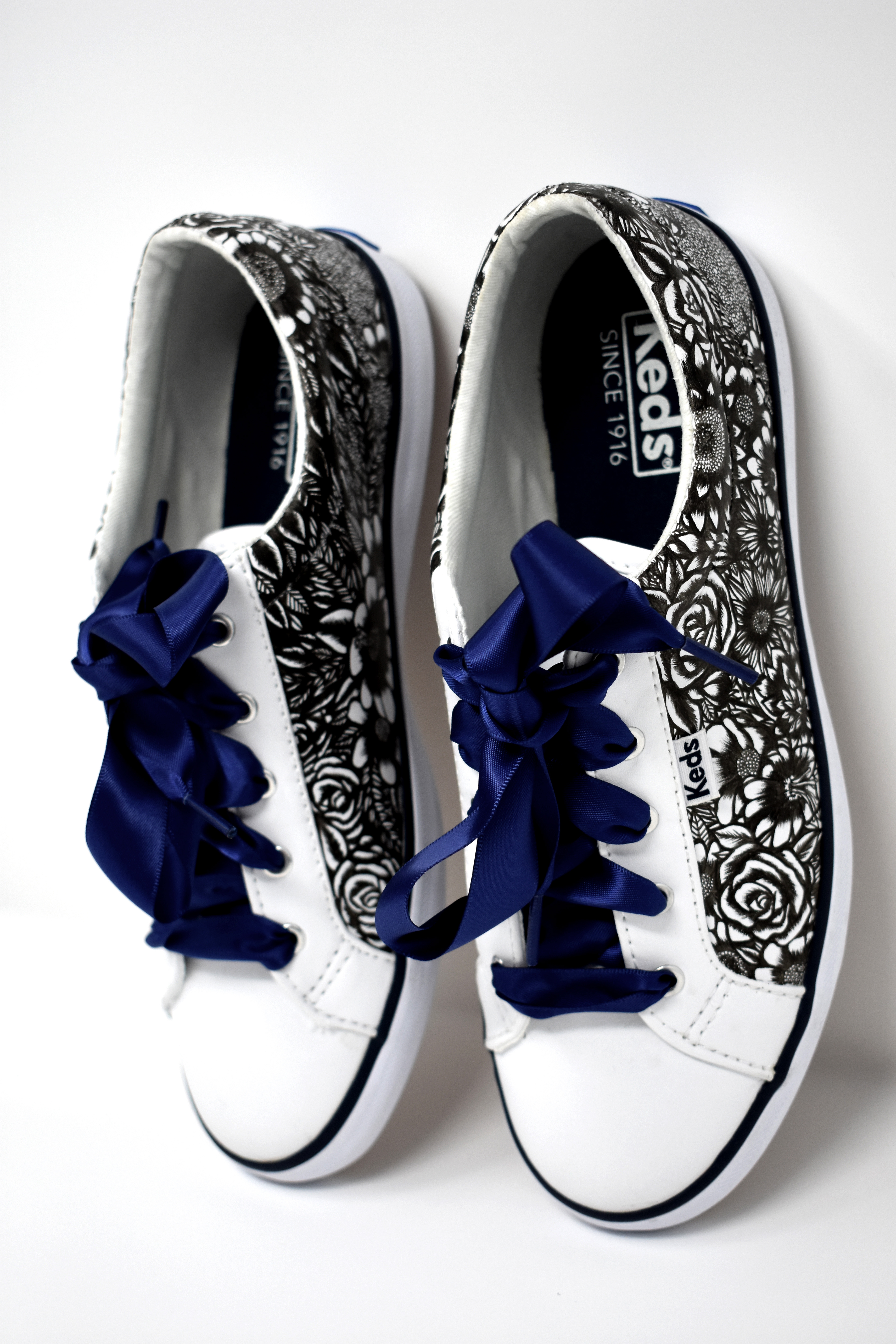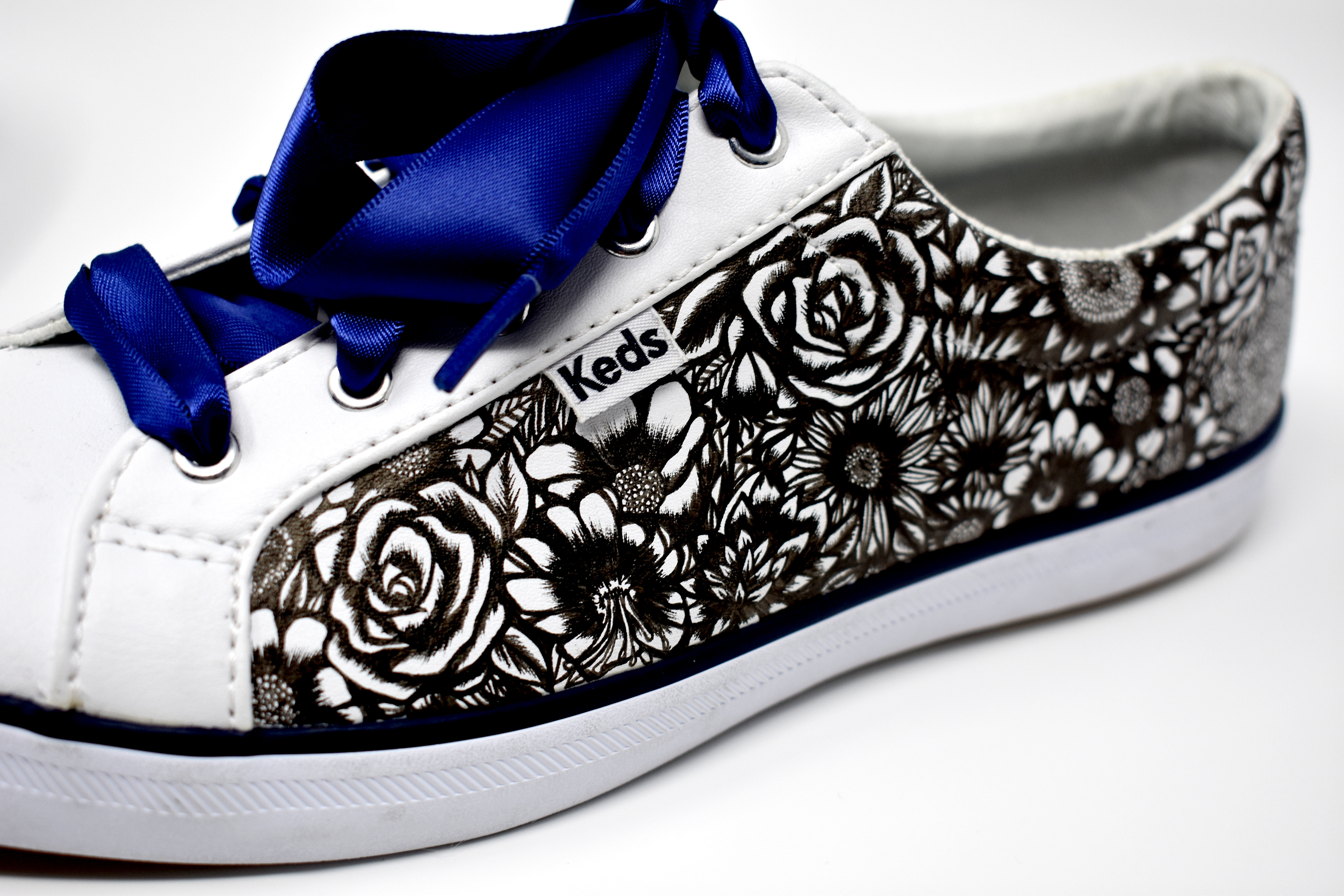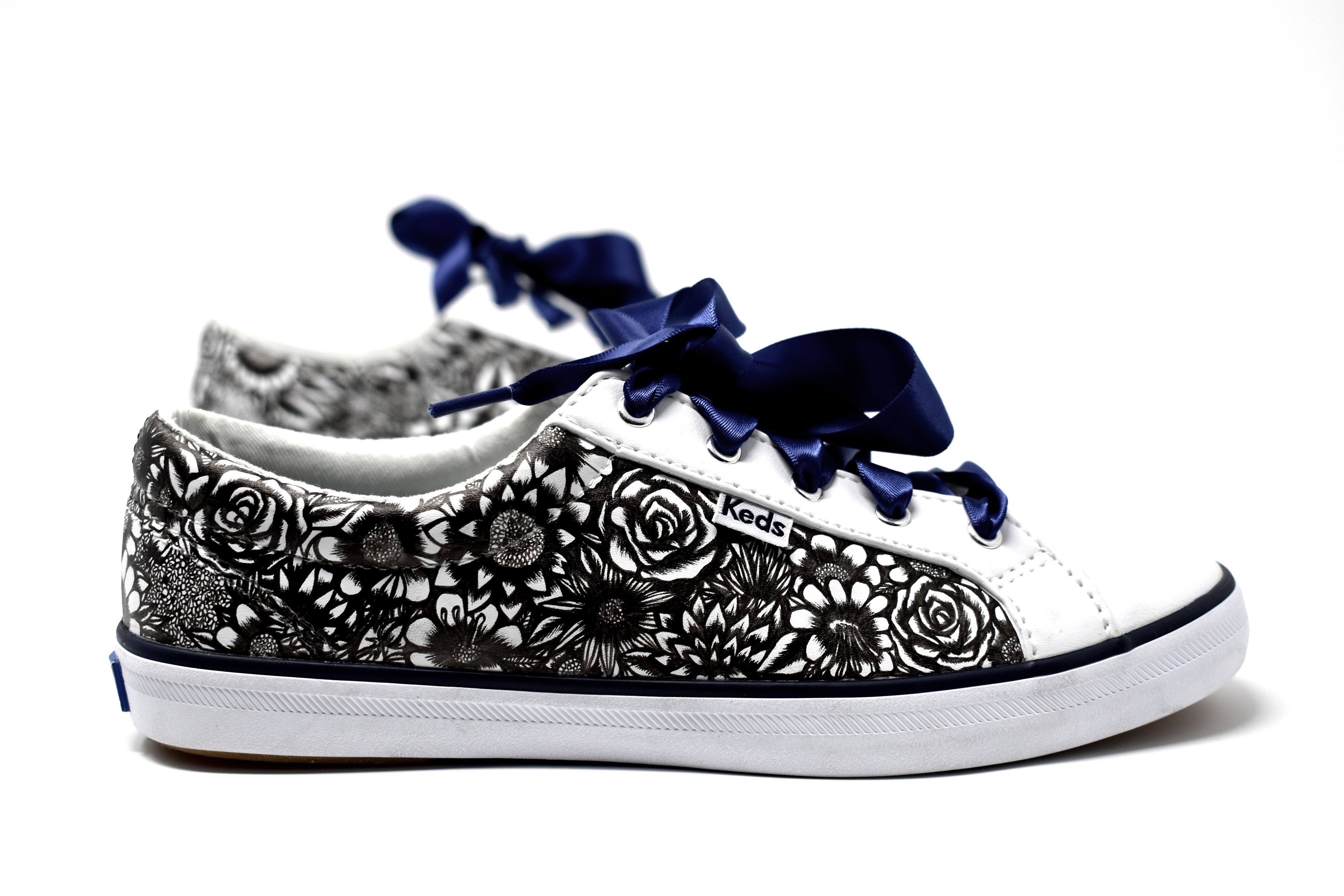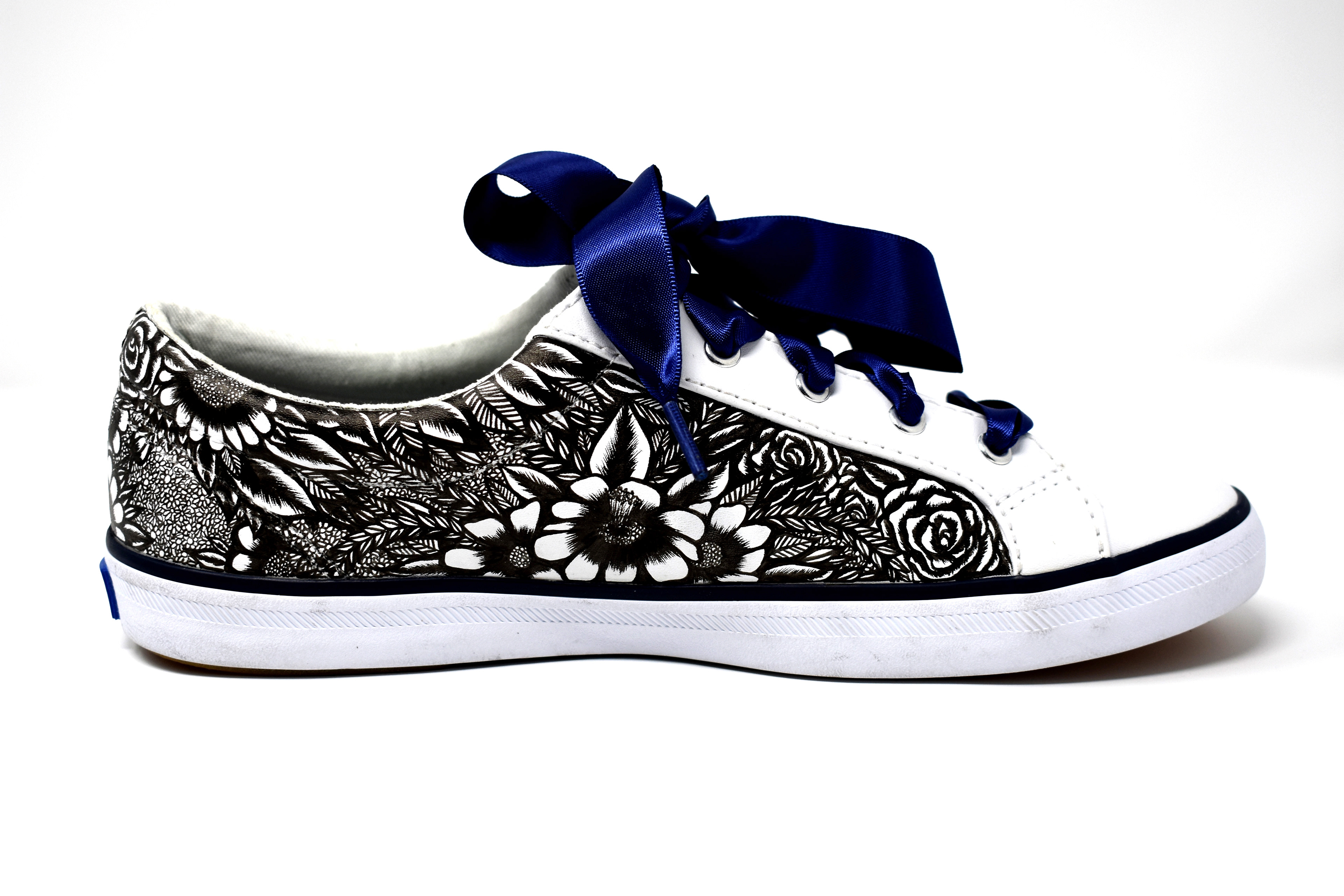 (2019) Ink on women's leather keds with navy ribbon laces These shoes are blooming with a variety of flowers and leaves to express femininity and nature.