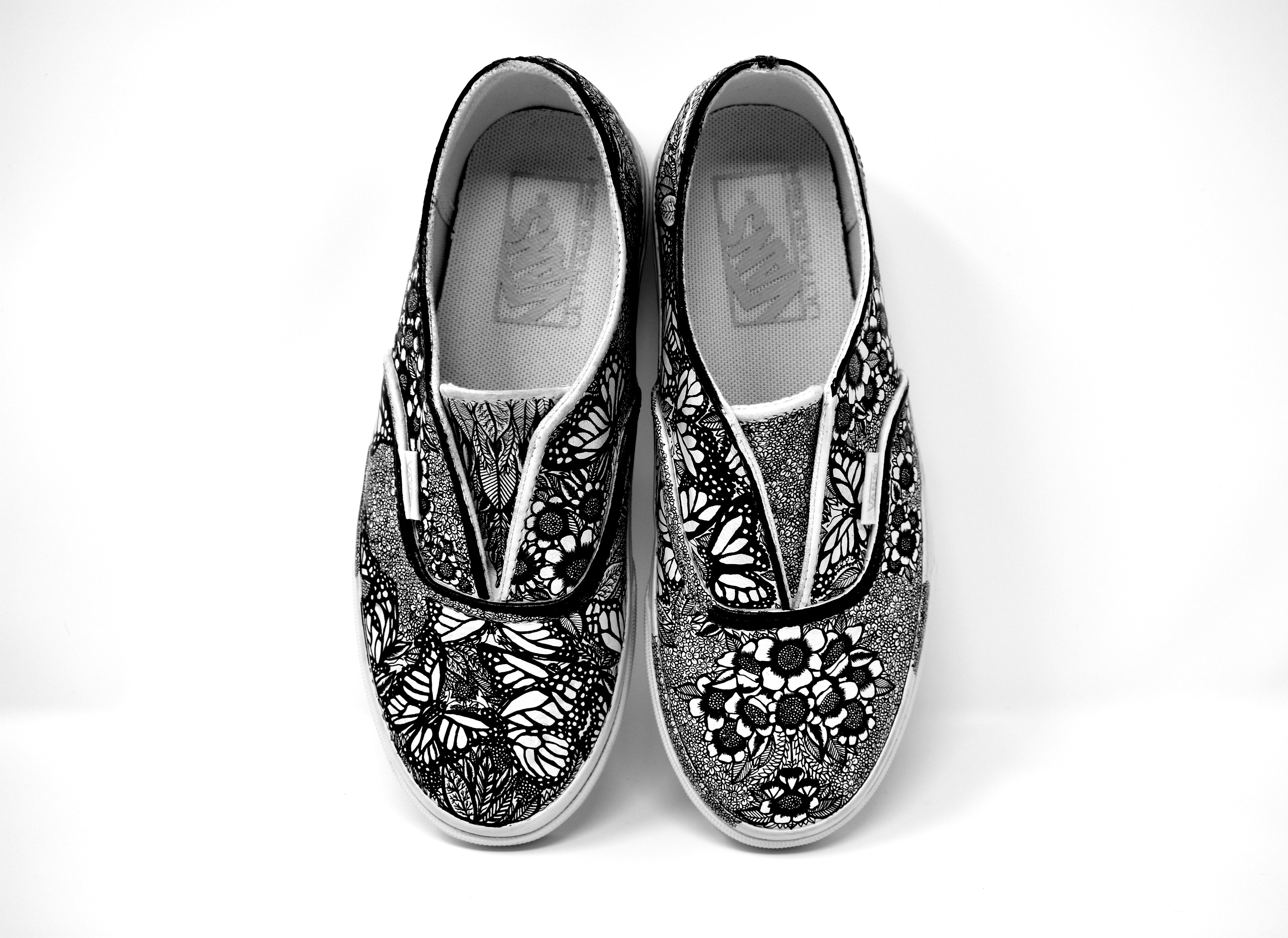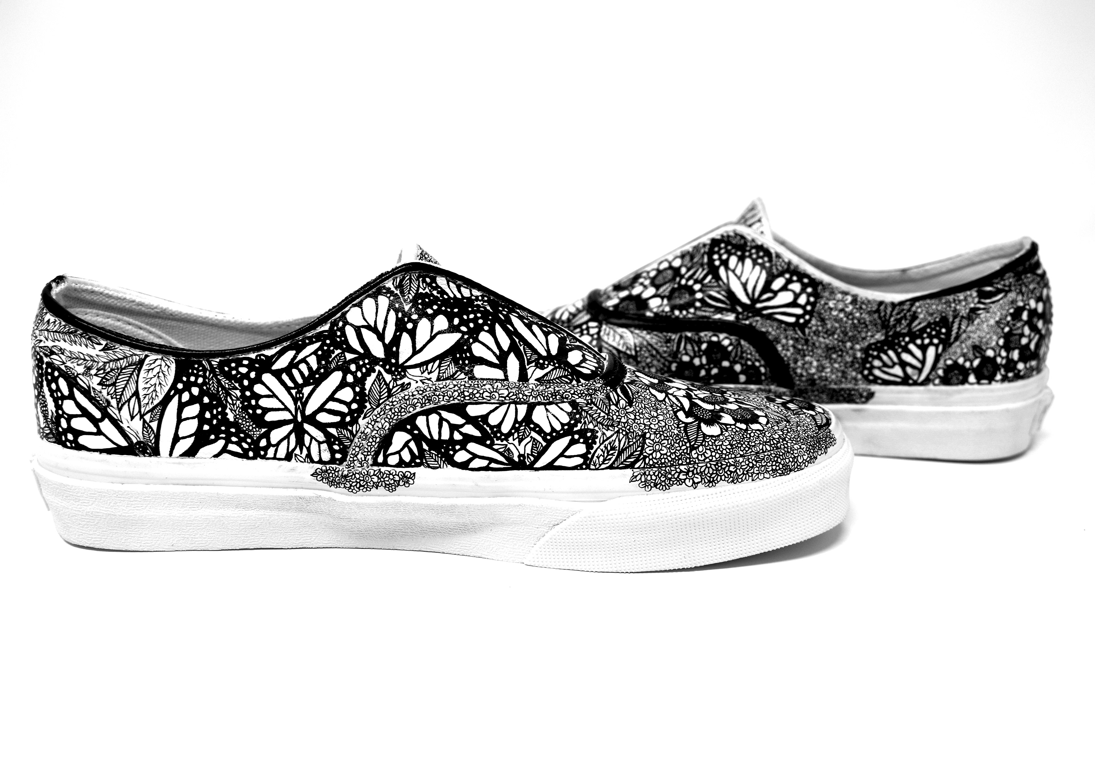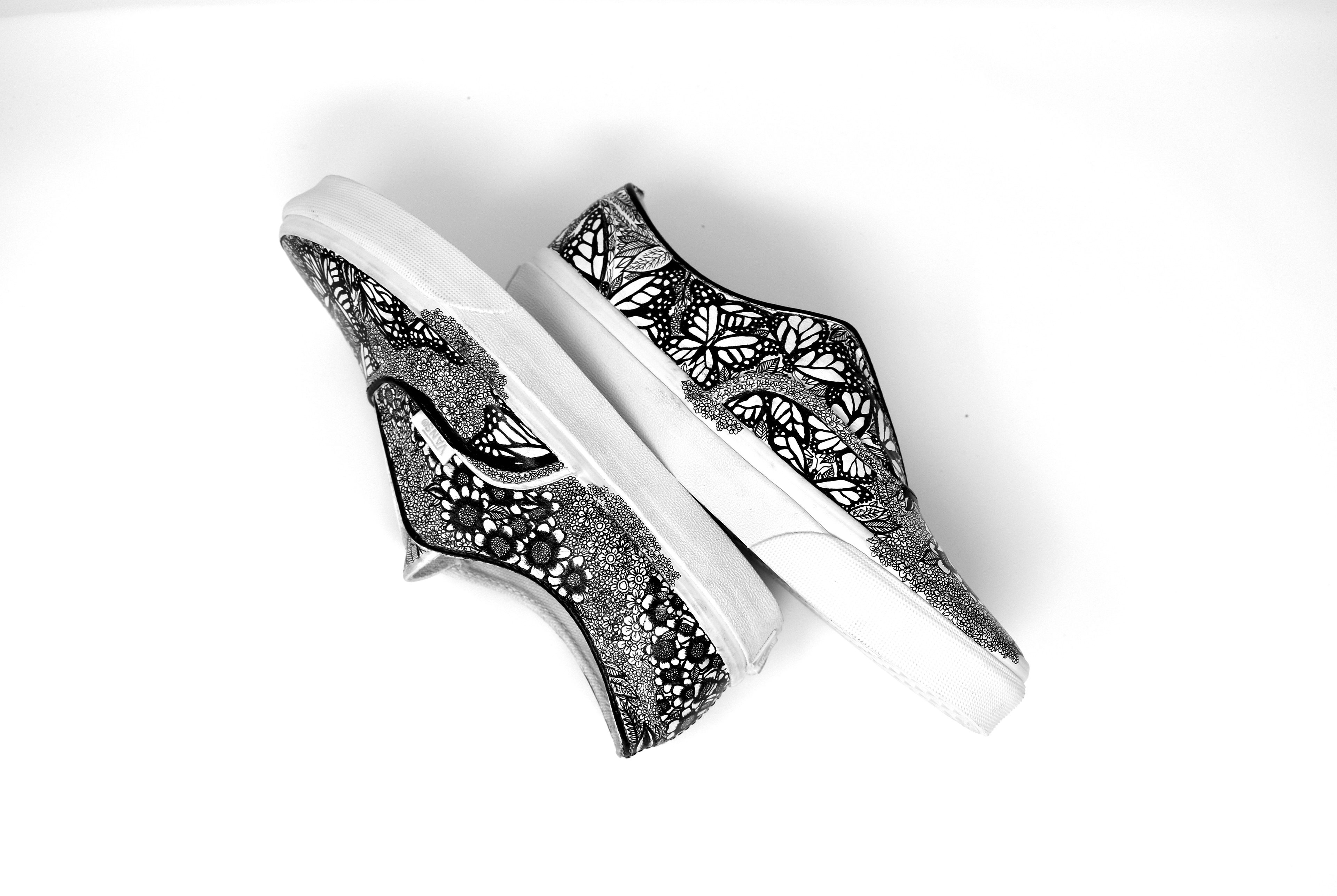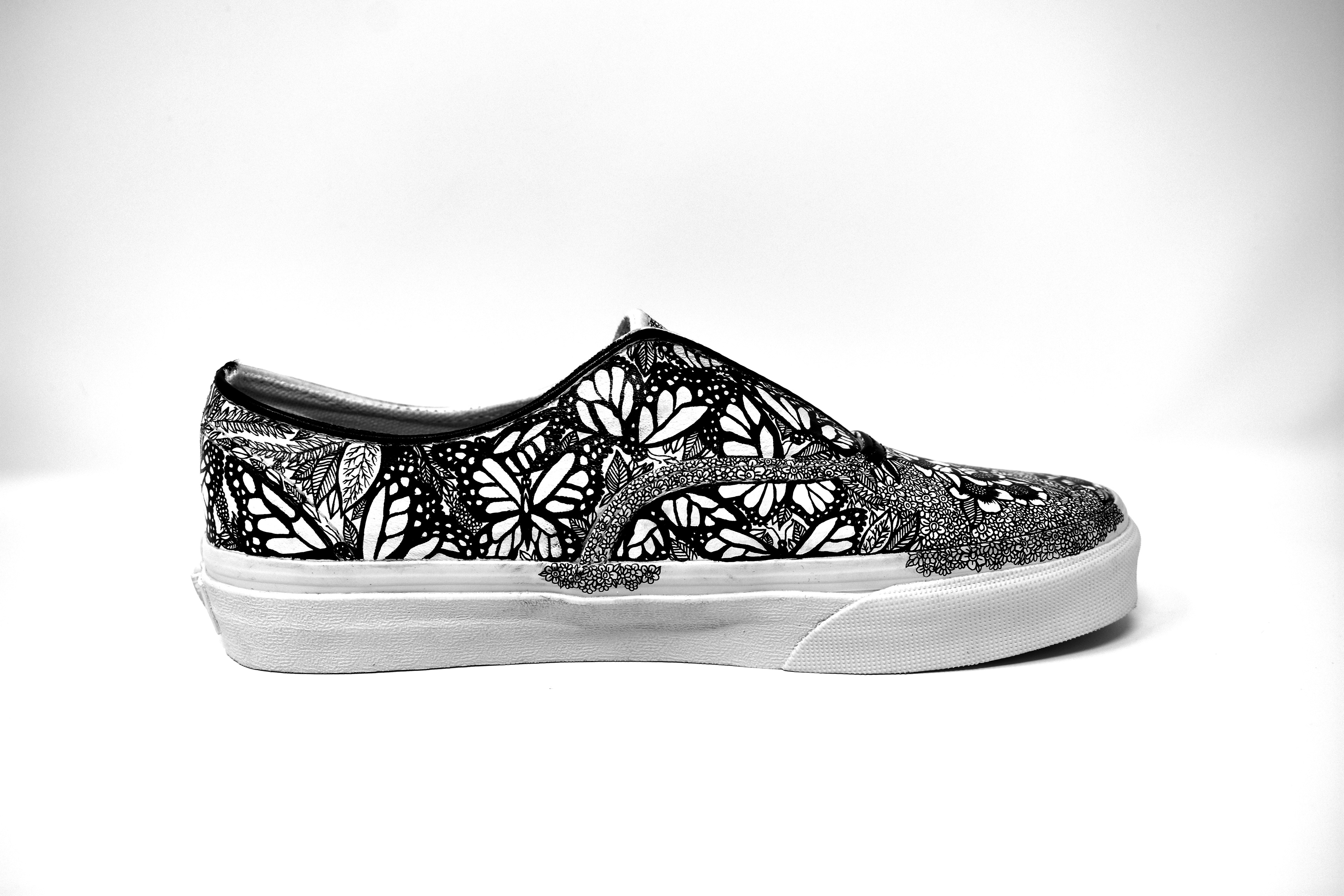 (2019) ink on white leather Vans These Vans are completely covered in butterflies and natural imagery as an expression of growth and feminine energy.