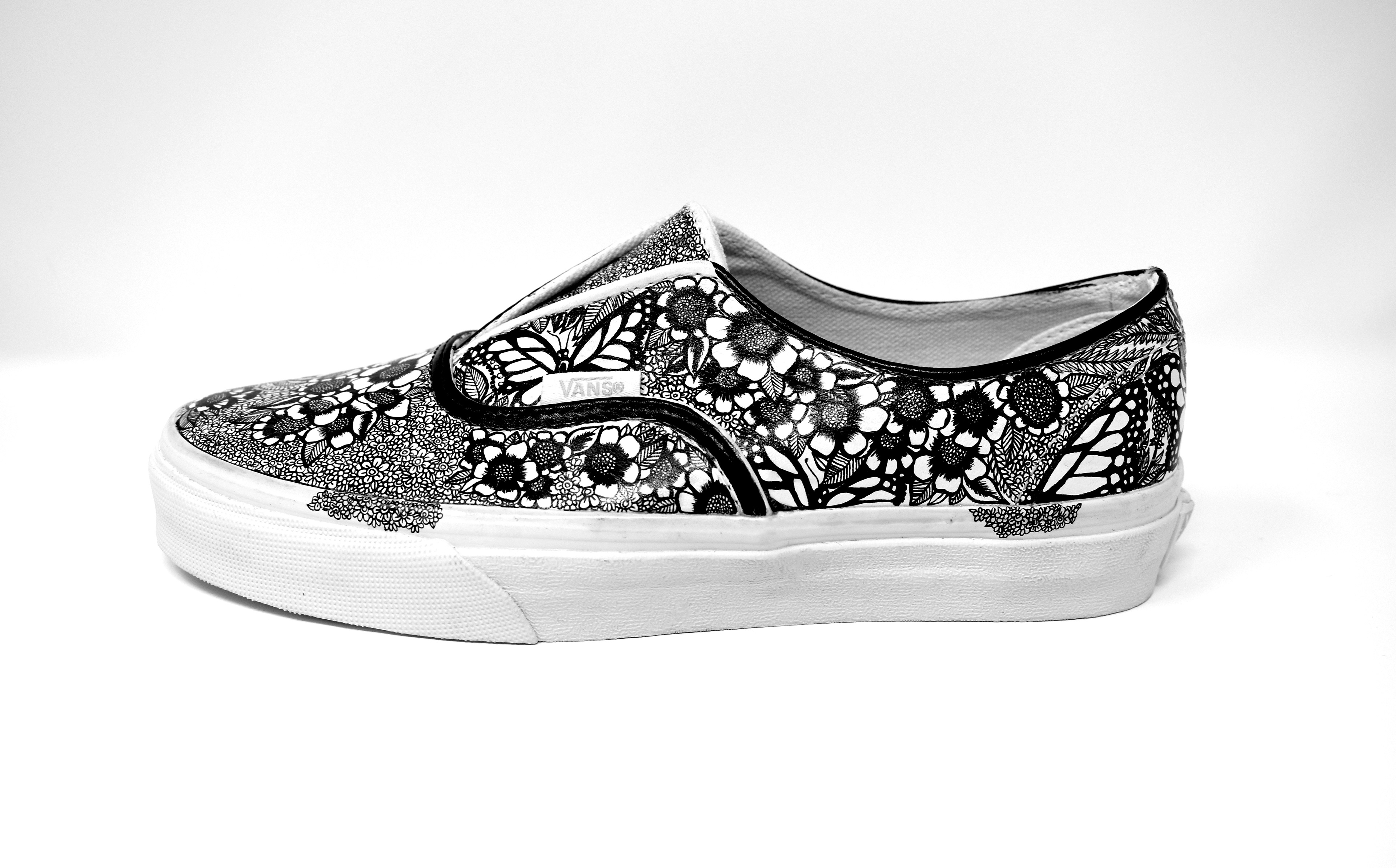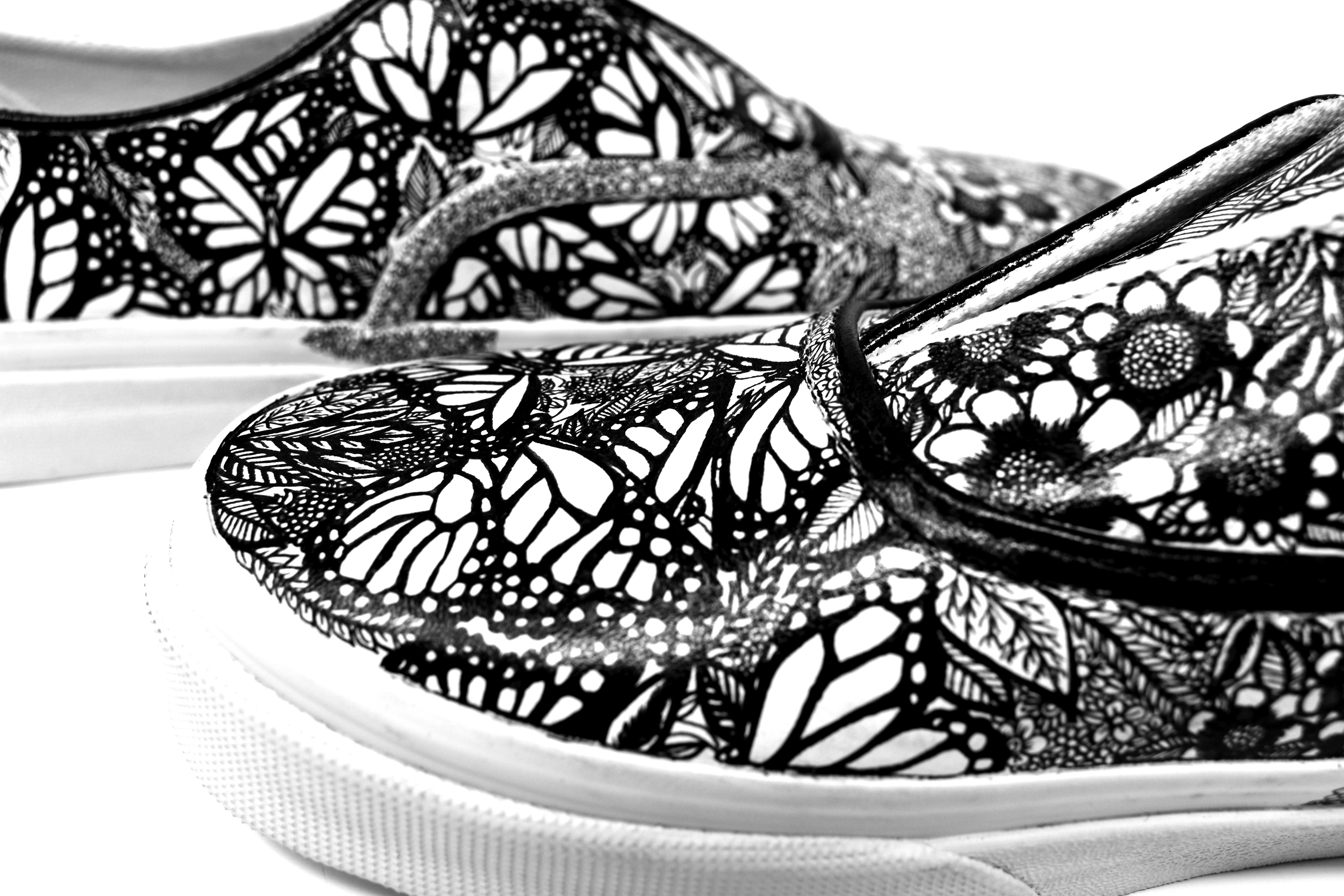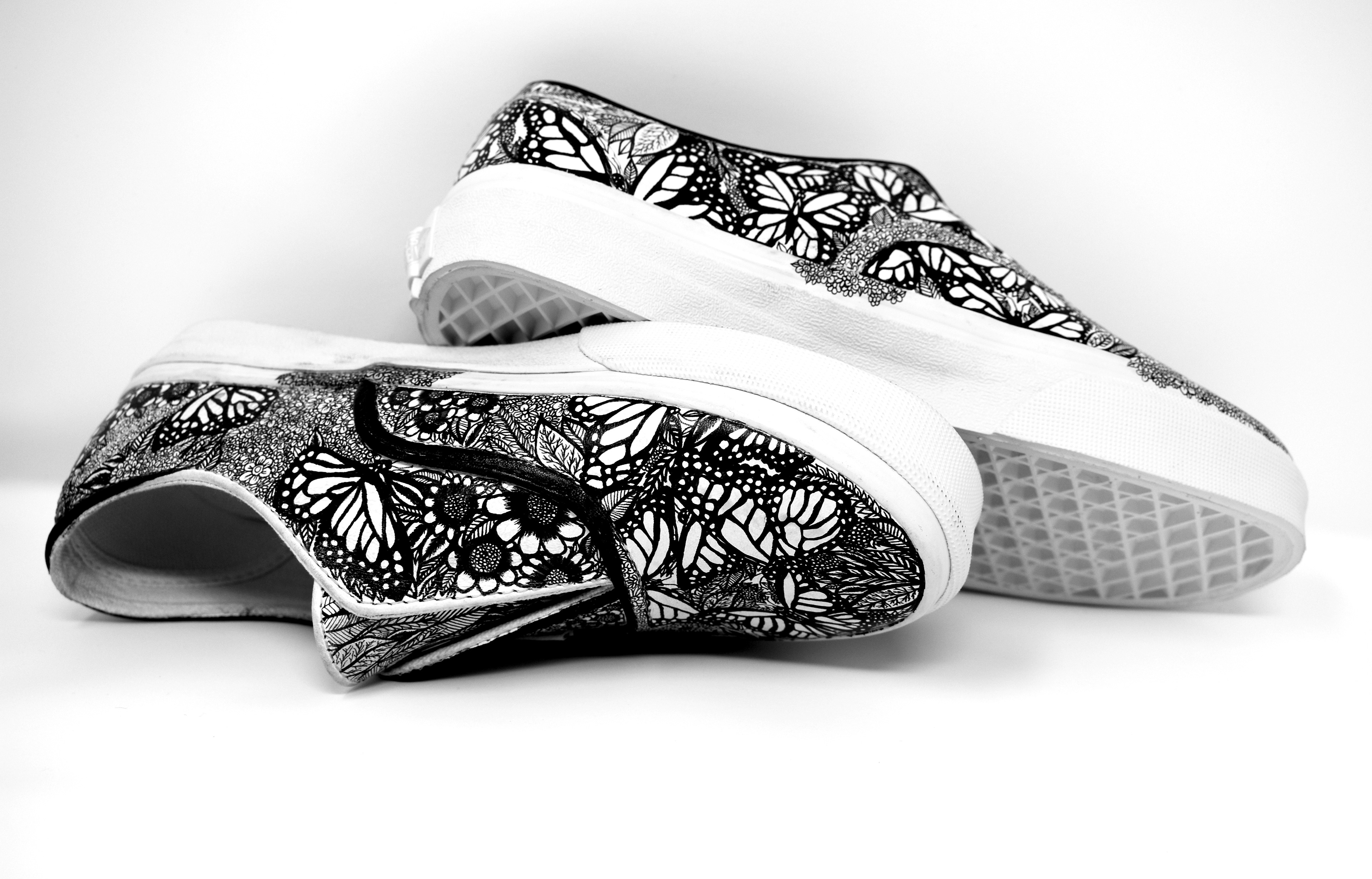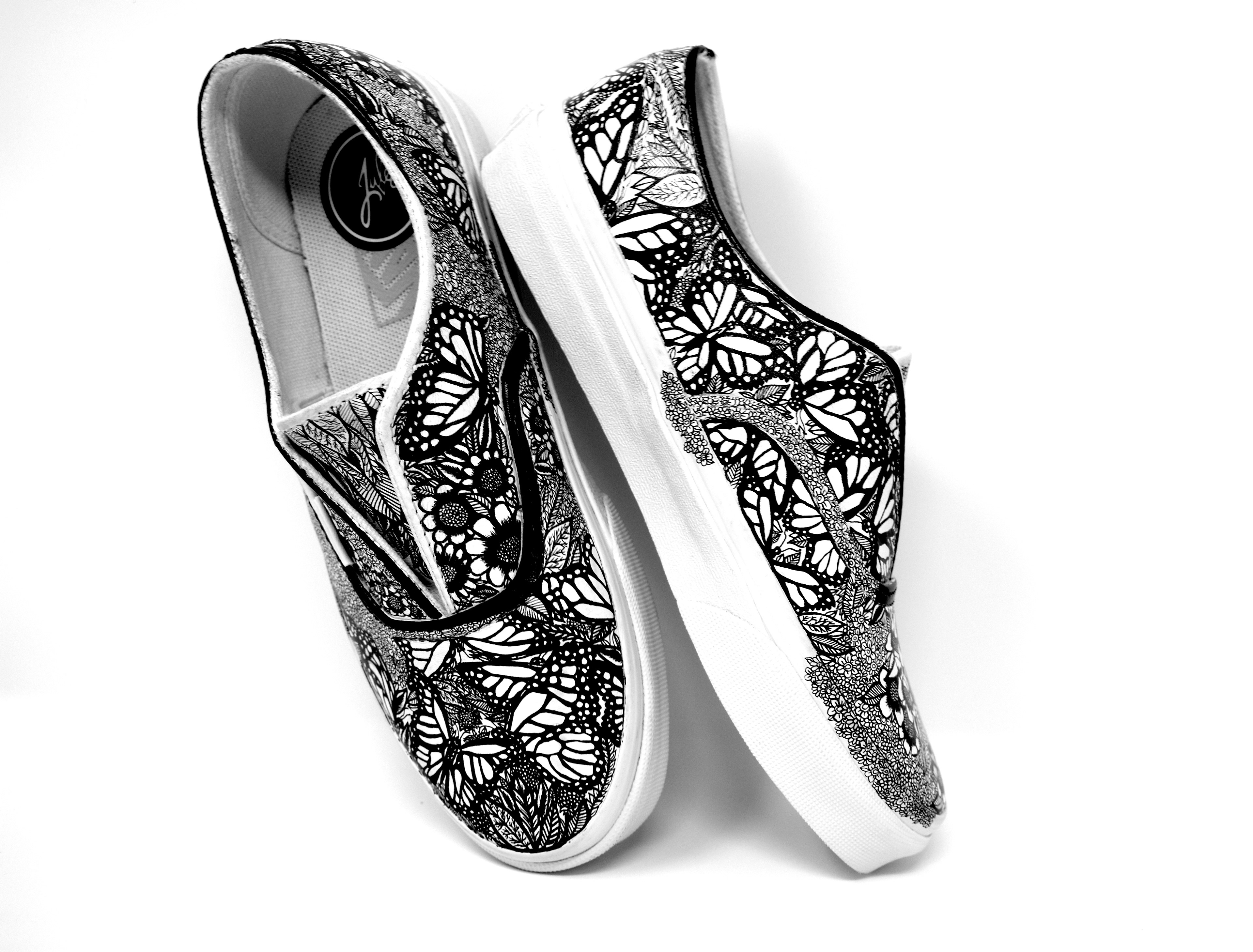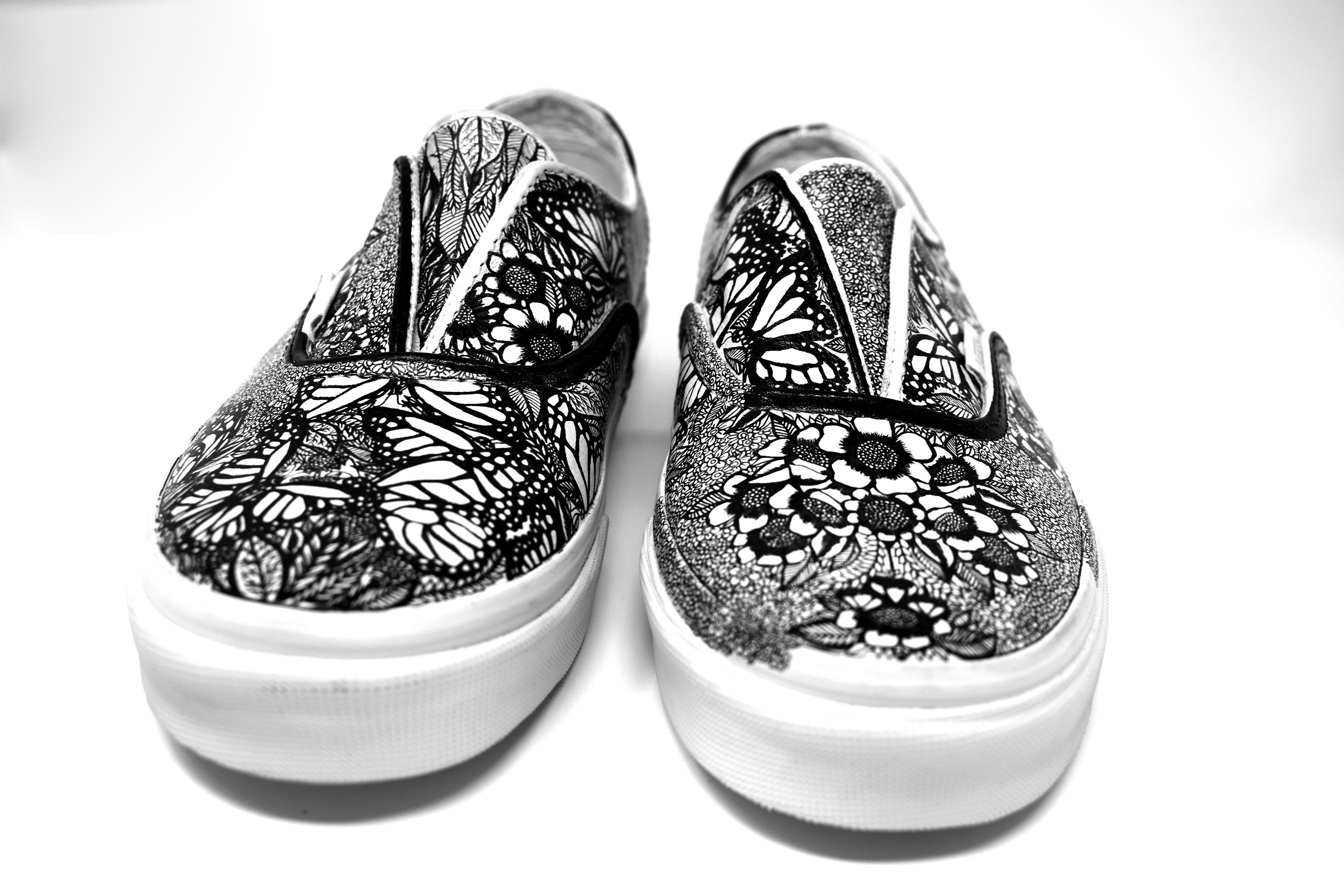(2019) ink on white leather Vans These Vans are completely covered in butterflies and natural imagery as an expression of growth and feminine energy.