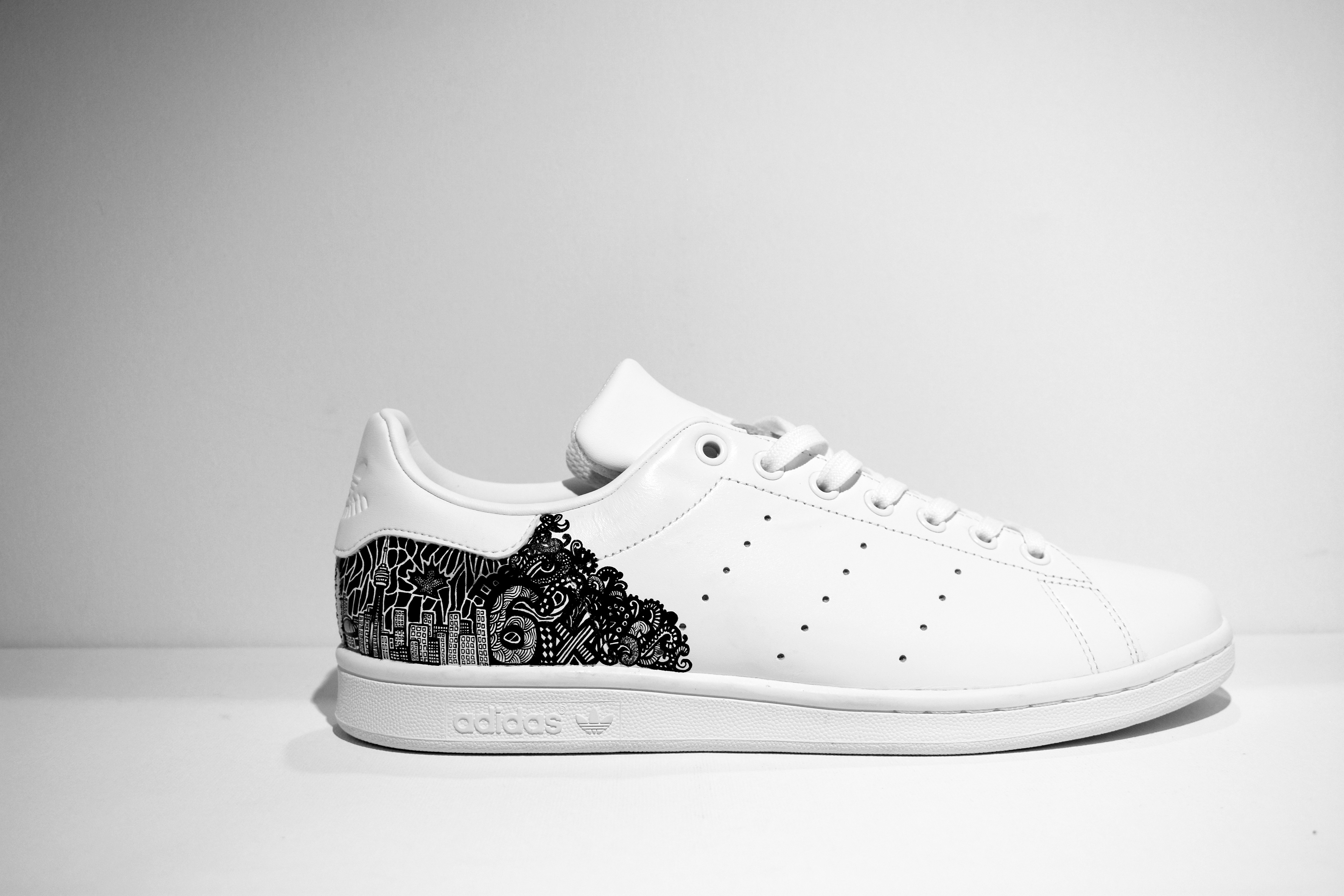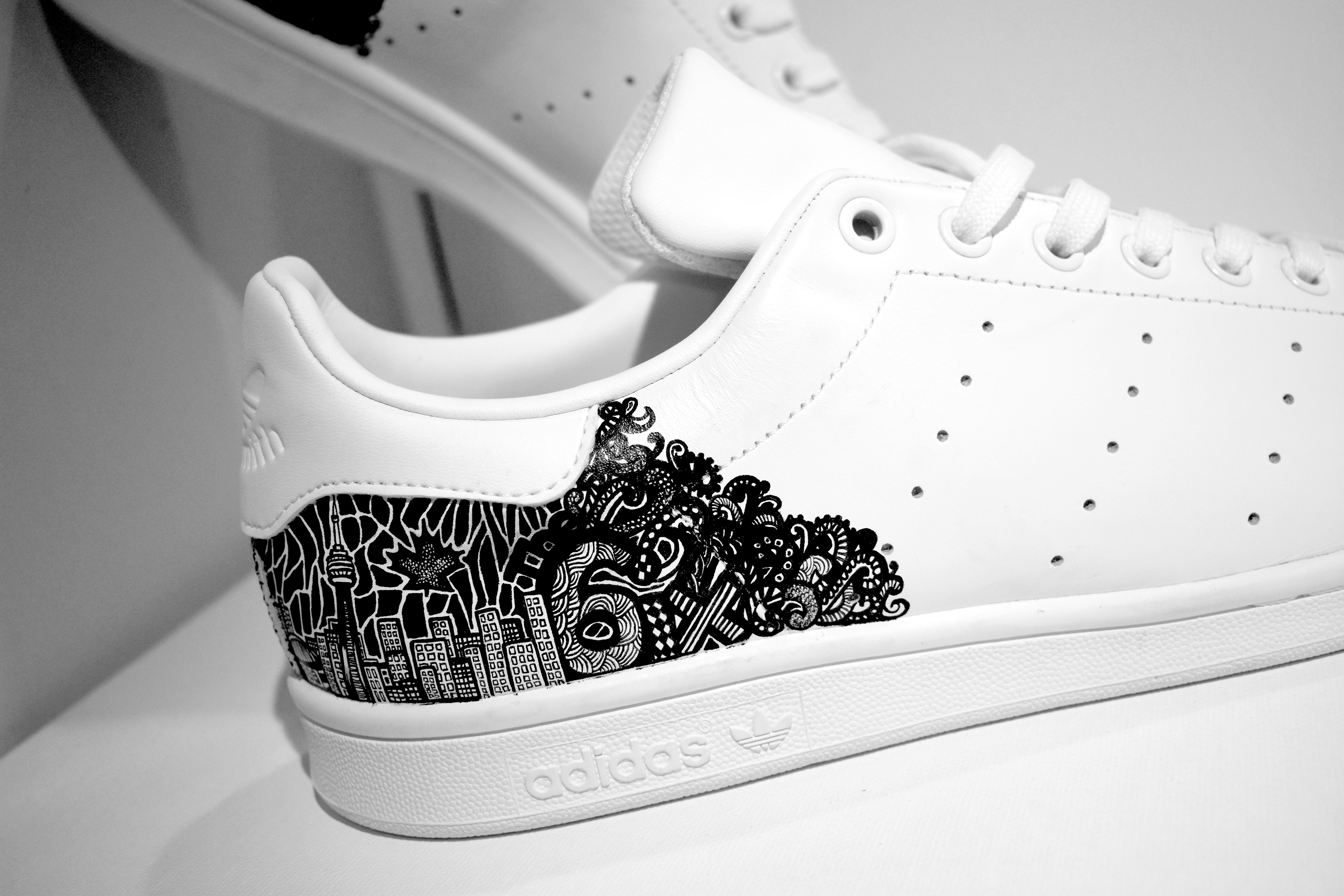 (2019) Ink on men’s all white Stan Smiths These shoes are a commission that represents the old versus new. The left shoe represents the individuals home town (Edmonton) and right represents their new town (Toronto). A series of images and symbols were incorporated to reflect both these places, as well as the individuals hobbies and interests.